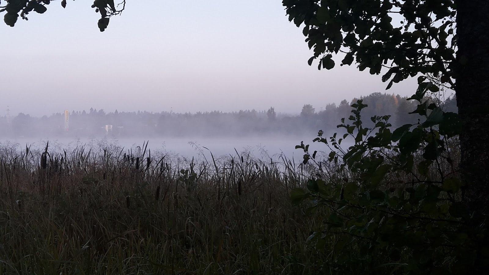Aamuauringon nousua on hieno seurata ulkoa käsin. Lämpötila oli vielä alle 4 ast ja sumua alkoi hitaasti muodostua. Myöhemmin sitä oli todella runsaasti.