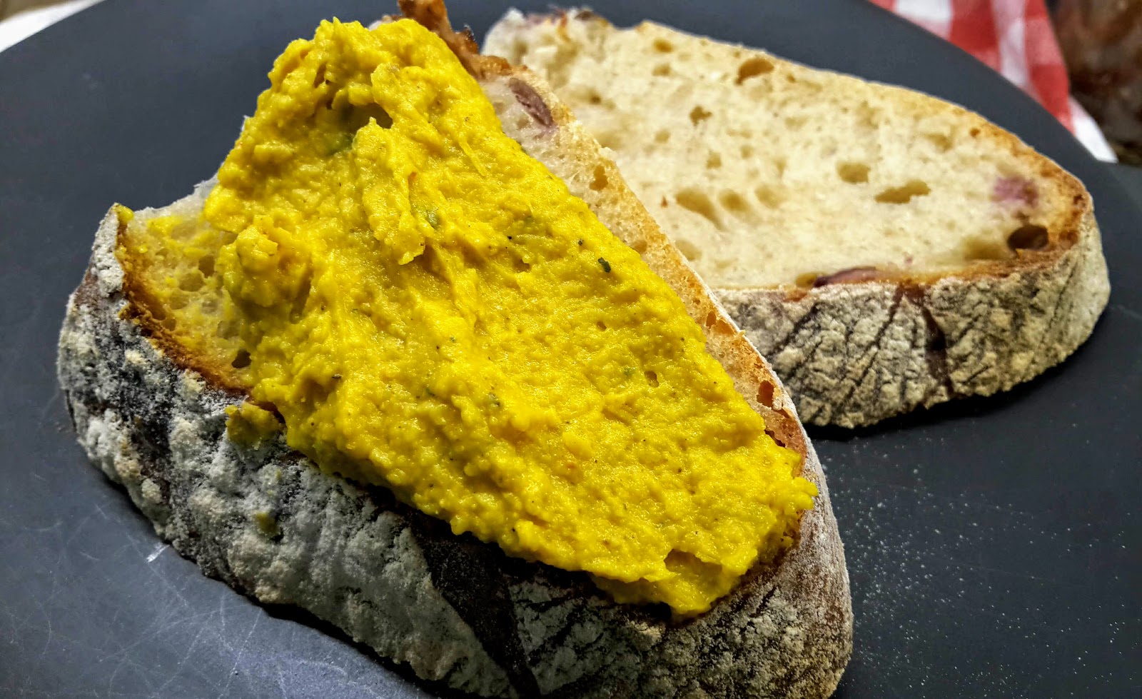 | Myskikurpitsahummus pysyy tomerasti uunituoreen leivän päällä. |